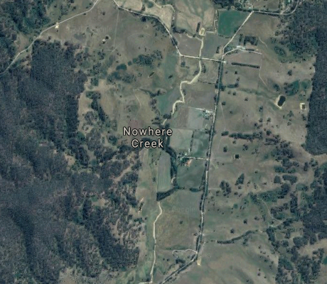 NOWHERE CREEK, VictoriaNowhere Creek is a small farming area in western Victoria, about an hour from Ballarat. It has its own postcode but, needless to say, there's nothing here and no information to be found about it.